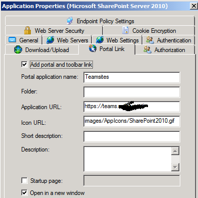 Incidentally, I elected to check the Portal and toolbar link checkbox as I wanted to test accessing the Sharepoint application thru the portal itself (as described earlier).