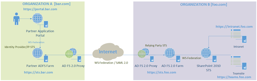 A user in Organization A (e.g:bar.com) clicks on a smart link on their portal (https://portal.bar.com) to access an claims-aware SharePoint Intranet web application in Organization B. This link  calls the AD FS instance in Organization B (e.g:foo.com) with the whr parameter set to the ADFS instance of Org A (http://sts.bar.com/adfs/services/trust) and the wtrealm parameter set to the Intranet web application (https://intranet.foo.com).