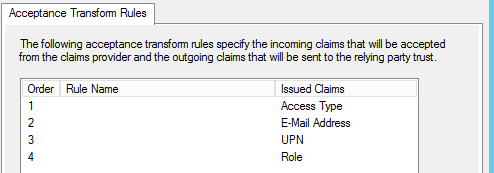 On the PointSharp Identity Federation claims provider, we pass the above claims as well as any additional claims that we also elect to emit.  On the claims provider pipeline in AD FS, we configure Acceptance Transform rules to pass the Access Type claims and any other rules that the Claims Provider STS has made available: