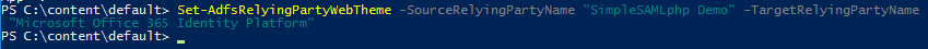 Set-AdfsRelyingPartyWebTheme -TargetRelyingPartyName “simpleSAMLphp Demo” -Logo @{path=”C:\Content\rp1\logo.png”} -Illustration @{path=”C:\Content\rp1\illustration.png”}