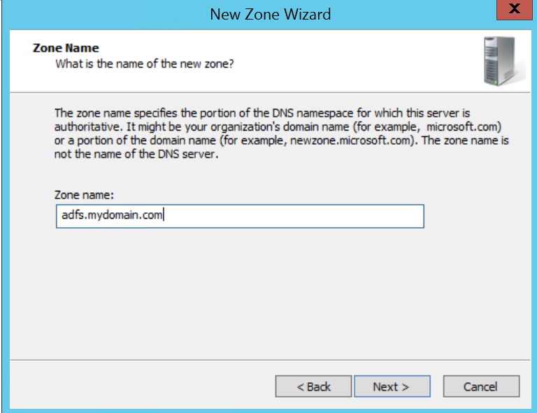 Let’s see how that works. On a European domain controller, we create a new primary forward lookup zone (adfs.mydomain.com)