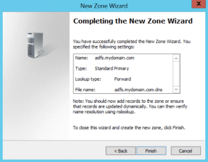 Once that’s done, we create an (A) record in DNS in the adfs.mydomain.com zone. Leave the name blank.