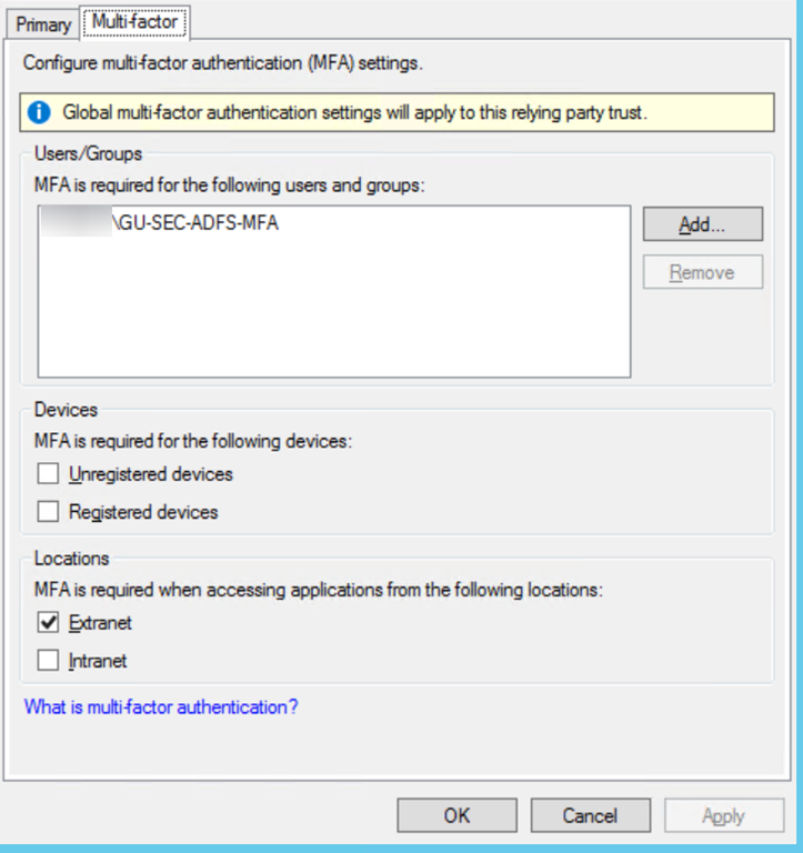 Here we have a specific user/group requiring MFA and also the location (Extranet) checkbox is checked. Users who are members of the GU-SEC-ADFS-MFA group must always use MFA, irrespective of their location AND other users, connecting from outside of the corporate network, will be challenged by the MFA handler. Again, if the intention was to enforce MFA for a combination of outcomes; namely, by group and location outside, then this is not the outcome.