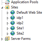 On our “application server” IIS is installed. Herein, I’ve created four websites (idp1, idp2, site1 and site2), representing two simpleSAMLphp SAML 2.0 identity providers and two simpleSAMLphp service providers. The website configuration can be seen in the below graphic: