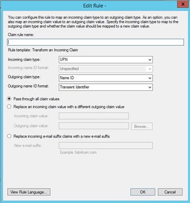 c:[Type == “http://schemas.microsoft.com/ws/2008/06/identity/claims/windowsaccountname”, Issuer == “AD AUTHORITY”] => issue(store = “Active Directory”, types = (“http://schemas.xmlsoap.org/ws/2005/05/identity/claims/upn”), query = “;userPrincipalName;{0}”, param = c.Value);