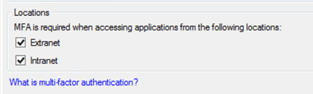 In the example below, MFA is required for securing access to applications outside of the organization, what Microsoft call Extranet use.