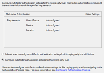 Let’s have a look at what happens when MFA is enabled through the AD FS Management UI. MFA policies can be triggered either globally (applicable to all relying parties), or on the relying party itself.