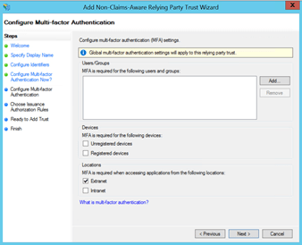 Set-AdfsRelyingPartyTrust –TargetRelyingParty $rp –AdditionalAuthenticationRules ‘c: [Type == "
