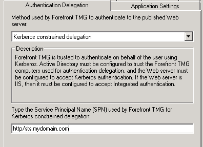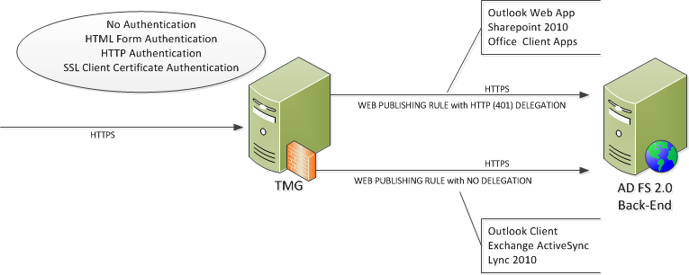 • Create a web publishing rule that triggers authentication (two-factor) on the TMG front-end and then uses delegation to the AD FS back-end using Negotiate authentication.