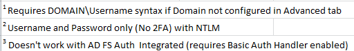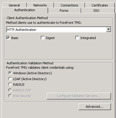 • Single factor (username/password) authentication for rich/active clients inside/outside the corporate environment… covering ActiveSync access from the outside, Outlook 200x from the inside/outside and  MEX clients, such as Lync 2010 inside/outside