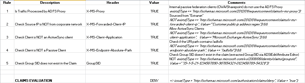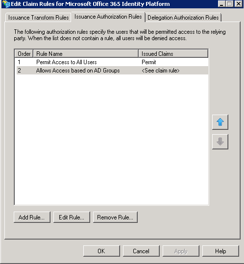 Looking at our O365 RP in PowerShell (Get-ADFSRelyingPartyTrust) , we see no access policies configured. Under the O365 Relying Party it’s blank.
