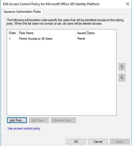 Looking at our O365 RP in PowerShell (Get-ADFSRelyingPartyTrust) , we see no access policies configured. Under the O365 Relying Party it’s blank.